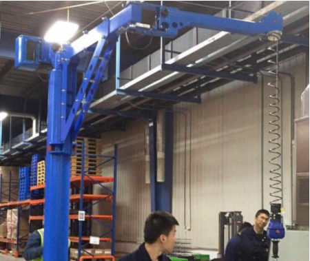 懸臂吊起重機工作強度為輕型,起重機由立柱,回轉臂回轉驅動裝置及電動葫蘆組成,立柱下端通過地腳螺栓固定在混凝土基礎上,由擺線針輪減速裝置來驅動懸臂回轉,電動葫蘆在懸臂工字鋼上作左右直線運行,并起吊重物。起重機旋臂為空心型鋼結構,自重輕,跨度大,起重量大,經濟耐用。內置式行走機構,采用帶滾動軸承的特種工程塑料走輪,摩擦力小,行走輕快;結構尺寸小,特別有利于提高吊鉤行程。
